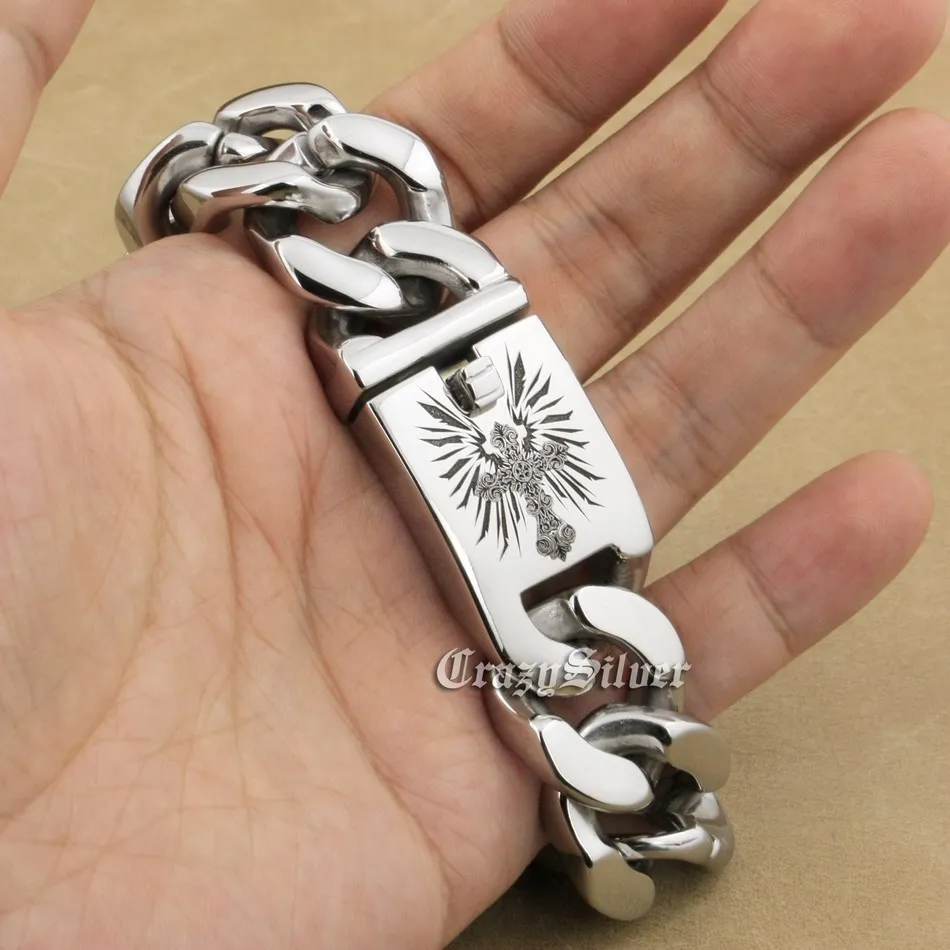 Special Offer for 9 Lengths 316L Stainless Steel Deep Engraved Angel Cross Mens Biker Rocker Punk Bracelet Engraving